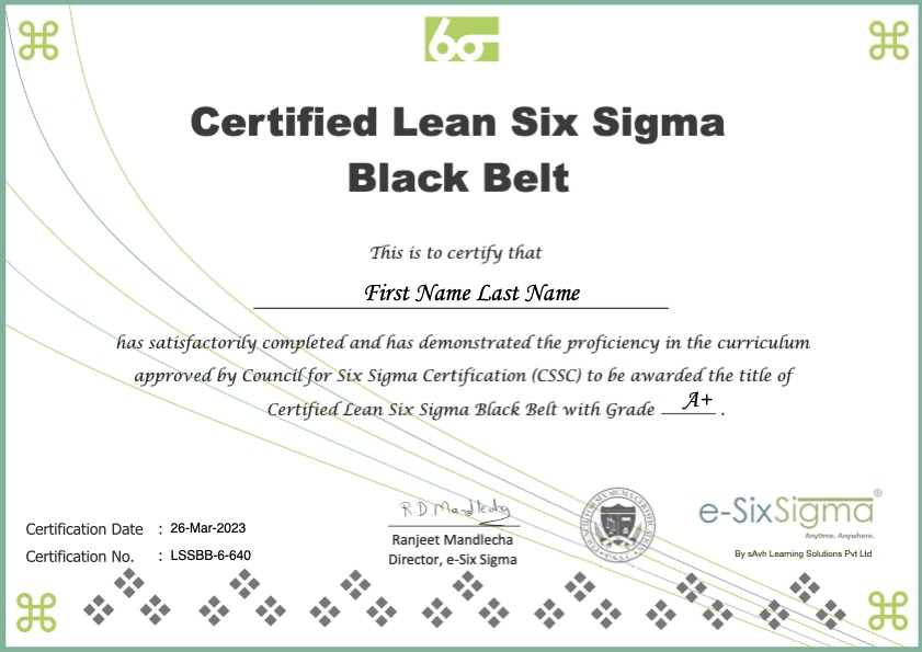 Depending upon the consolidated scores out of Toal 350 Points in AWYL Activities & the Test, a Grade (A+, A, B+, B, C & D) is automatically assigned to a Lean Six Sigma Black Belt Functional Certificate, which can be generated immediately in PDF format after the Test. You can request physical copy of the certificate by paying a nominal amount.
